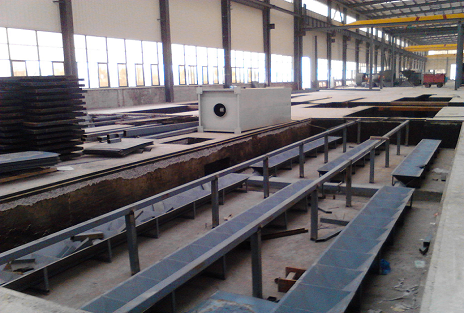 鋼結構件機械式噴砂房設計依據:工件名稱:鋼結構件 2.最大工件尺寸:15000×1000×1500mm 3.工件最大重量:10000kg 4.工作制度: 260天/年,8小時/天,單班生產; 5.工件產量: 8件/天; 6.輸送方式:臺車;