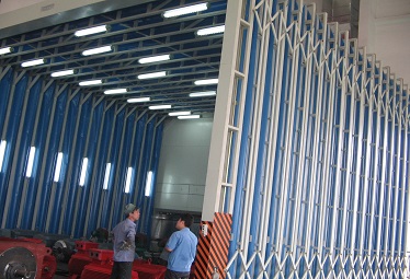 采用工業型材制成,是驅動電機直接帶動的部分,整個伸縮機構穩定運動的關鍵所在。大門框架上設置有開關按鈕并行程開關,用以自動控制大門的伸縮 | 除去門框,其余部位就是帆布支撐網,是阻燃帆布安裝連接的骨架,由多組型材骨架構成,并通過剪式伸縮機構將整個相對獨立的骨架連接在一起,形成一個穩定的整體 | 在每兩個帆布支撐網之間,采用剪式伸縮機構相連,其結構尺寸決定了伸縮量,同時為了保證上下都能同時實現伸縮動作,在每側上下各布置一套剪式伸縮機構,兩者之間通過連桿形成一個同步運動機構 | 在整個網架之間采用工業阻燃PVC帆布,這是形成相對封閉作業間的“墻板”,也是保證空氣有序流動的“房體”。安裝時每兩個支撐網采用一塊工業帆布 | 驅動部分采用減速電機,傳動到多節長軸上,再由長軸兩端鏈輪同步傳動到兩側主動輪上。整個驅動前進、后退采用三級保護:雙向兩級行程保護軌道終端設置限位車擋;門柱兩邊有控制盒,操作方便;噴室頂部設有運行警示燈。減速器選用東方傳動的K系列:斜齒輪-螺旋錐齒輪減速器 |