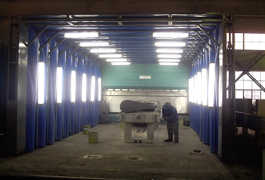 照明系統室內設置上、下兩排照明裝置。頂側燈組呈45o角安裝,布置方式為:2支×40W×2側;腰側燈組間隔安裝于墻板內,布置方式為:2支×40W×2行。所有燈箱均采用δ1.2鍍鋅板制作,并噴白漆美觀大方,又可防止銹跡象產生。燈管采用隔爆型飛利浦高效光源,既安全又節能且維護方便,鎮流器采用噴漆室專用電子鎮流器,從而保證每個噴漆室體光強≥800Lux,滿足工件各端面的噴涂作業。燈箱與壁板用小角鐵相連,同時燈箱上安有可拆框架,便于維護。 | ![]() |