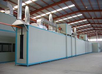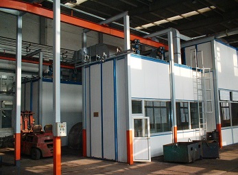 在工作時(shí),通過(guò)新風(fēng)機(jī)組內(nèi)的換熱裝置對(duì)循環(huán)風(fēng)進(jìn)行加熱。烘干設(shè)計(jì)溫度0~80±5℃,加熱能源天燃?xì)猓瑹犸L(fēng)從頂部送入,下部回風(fēng)。以保證烘干室各段風(fēng)量、溫度均勻。工件烘干過(guò)程中,工件漆膜內(nèi)殘存的有機(jī)溶劑不斷揮發(fā)出來(lái),為了使烘干室內(nèi)的氣體中有機(jī)溶劑的含量低于爆炸濃度的下限,烘干室保持安全運(yùn)行,循環(huán)熱風(fēng)中要補(bǔ)充一定的新鮮空氣,同時(shí)要排出一定量的高濃度的廢氣。烘干室內(nèi)裝有溫度傳感器,以顯示各點(diǎn)溫度,并設(shè)有自動(dòng)調(diào)溫裝置,使溫度波動(dòng)控制在±5℃以內(nèi)。 | 天然氣加熱烤漆烘干房在工作時(shí),新風(fēng)空氣通過(guò)燃燒器加熱后,在循環(huán)風(fēng)機(jī)作用下經(jīng)過(guò)過(guò)濾器,進(jìn)入烘干室底部的送風(fēng)管道,熱風(fēng)從出風(fēng)口出排出進(jìn)入烘干室內(nèi),對(duì)工件表面漆膜進(jìn)行烘干,利用熱空氣上升原理,在頂部設(shè)置回風(fēng)管路再進(jìn)入循環(huán)風(fēng)機(jī)組,使熱風(fēng)能循環(huán)使用。 |